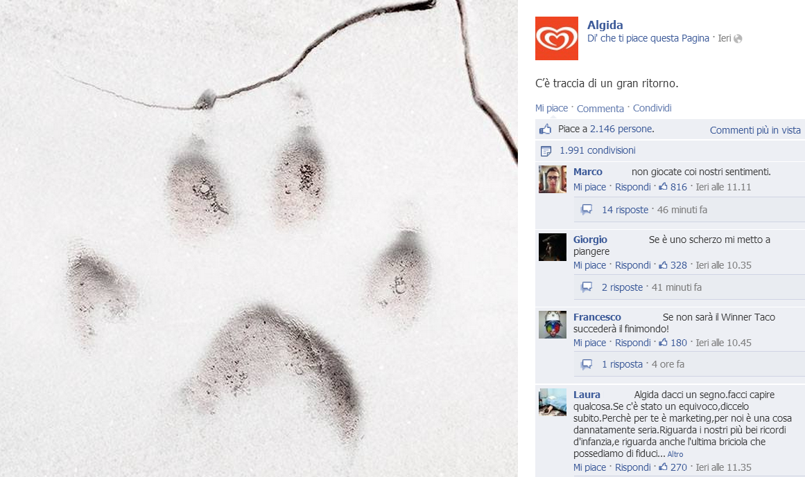 | Pagina Facebook di Algida: post teaser per il rilancio di Winner Taco (15/1/2014) |
