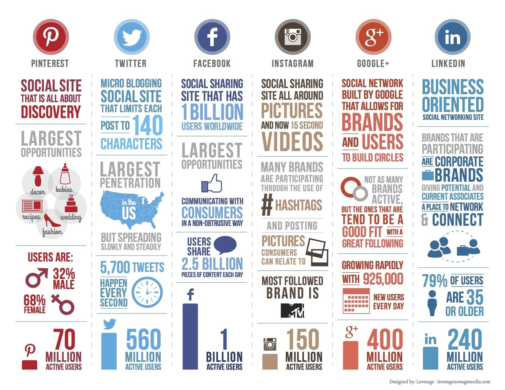 Condivido quindi con piaceree questa infografica di Leverage New Media, agenzia di St. Louis, che ci parla dei più noti social media, delle loro peculiarità e di alcune caratteristiche molto interessanti, da tenere a mente nello svolgimento della nostra attività.